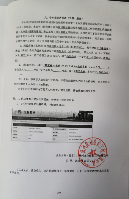 五、評審專(zhuān)家名單:許勇、邵士錦、李橋平 六、代理服務(wù)收費標準及金額:本次采購招標代理費為4200元,由采購人支付 七、公告期限 自本公告發(fā)布之日起1個(gè)工作日。 八、其他補充事宜 成交供應商為小型企業(yè)。 九、凡對本次公告內容提出詢(xún)問(wèn),請按以下方式聯(lián)系。 1.采購人信息 名 稱(chēng):揚州錦匯置業(yè)投資有限公司 地 址:潤揚北路8號 2. 采購代理機構信息 名 稱(chēng):江蘇潤泰工程項目管理咨詢(xún)有限公司 地 址:揚州市連運路77號東首六樓 聯(lián)系方式:18012335677 3.項目聯(lián)系方式 項目聯(lián)系人:李工 電 話(huà):18012335677 中小企業(yè)聲明函.png
