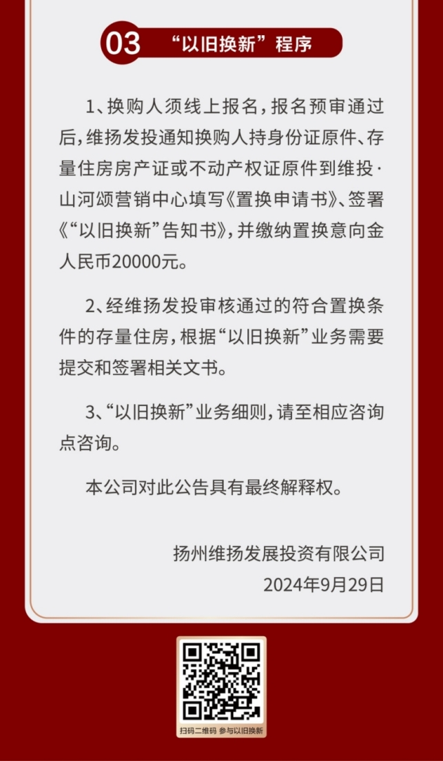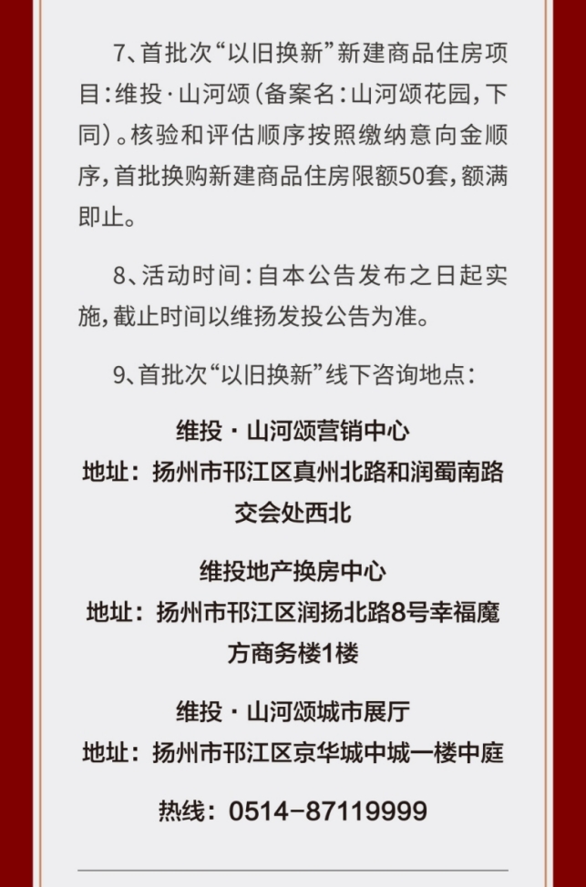 作為國企,維揚發(fā)投積極響應政府新推行的“以舊換新”政策,此次以其自主開(kāi)發(fā)的維投·山河頌項目為試點(diǎn),由國企背書(shū)、置換范圍廣、全流程專(zhuān)業(yè)服務(wù)。自公布“以舊換新”消息以來(lái),維投地產(chǎn)線(xiàn)下三個(gè)“以舊換新”咨詢(xún)地點(diǎn)人氣持續爆棚!前來(lái)咨詢(xún)的購房者絡(luò )繹不絕。維投地產(chǎn)在開(kāi)盤(pán)前就擺出誠意,給足買(mǎi)房人信心。通過(guò)“以舊換新”,買(mǎi)房人可以直接置換明月湖畔聯(lián)排別墅,改善一步到位!目前首批推出的換購新建商品住房限額50套“以舊換新”登記即將接近尾聲,感興趣的買(mǎi)房人抓緊時(shí)間辦理申請。